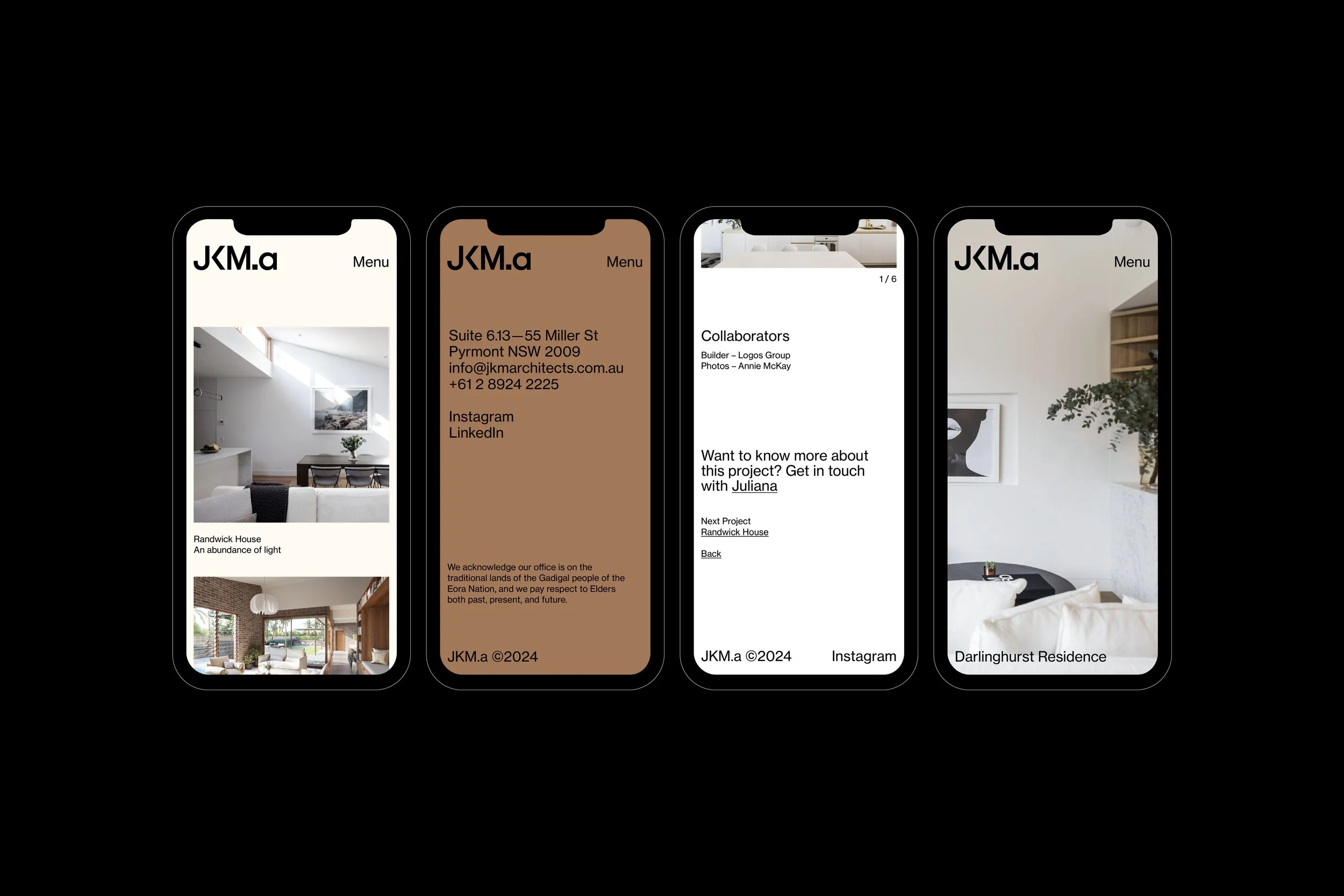 In shaping the brand’s new expression, we established an elegant aesthetic with restraint. A warm color palette anchors the system, while bold notes of contrast bring a contemporary edge. Neue Haas Grotesk provides clarity and refinement while delivering a clean, confident voice. The logos geometric letterforms evoke modernist precision and a distilled version reflects the studio’s ability to express complexity through simplicity. Used in moderation, the animated logo becomes a dynamic expanding centerpiece for the brand to showcase their work.